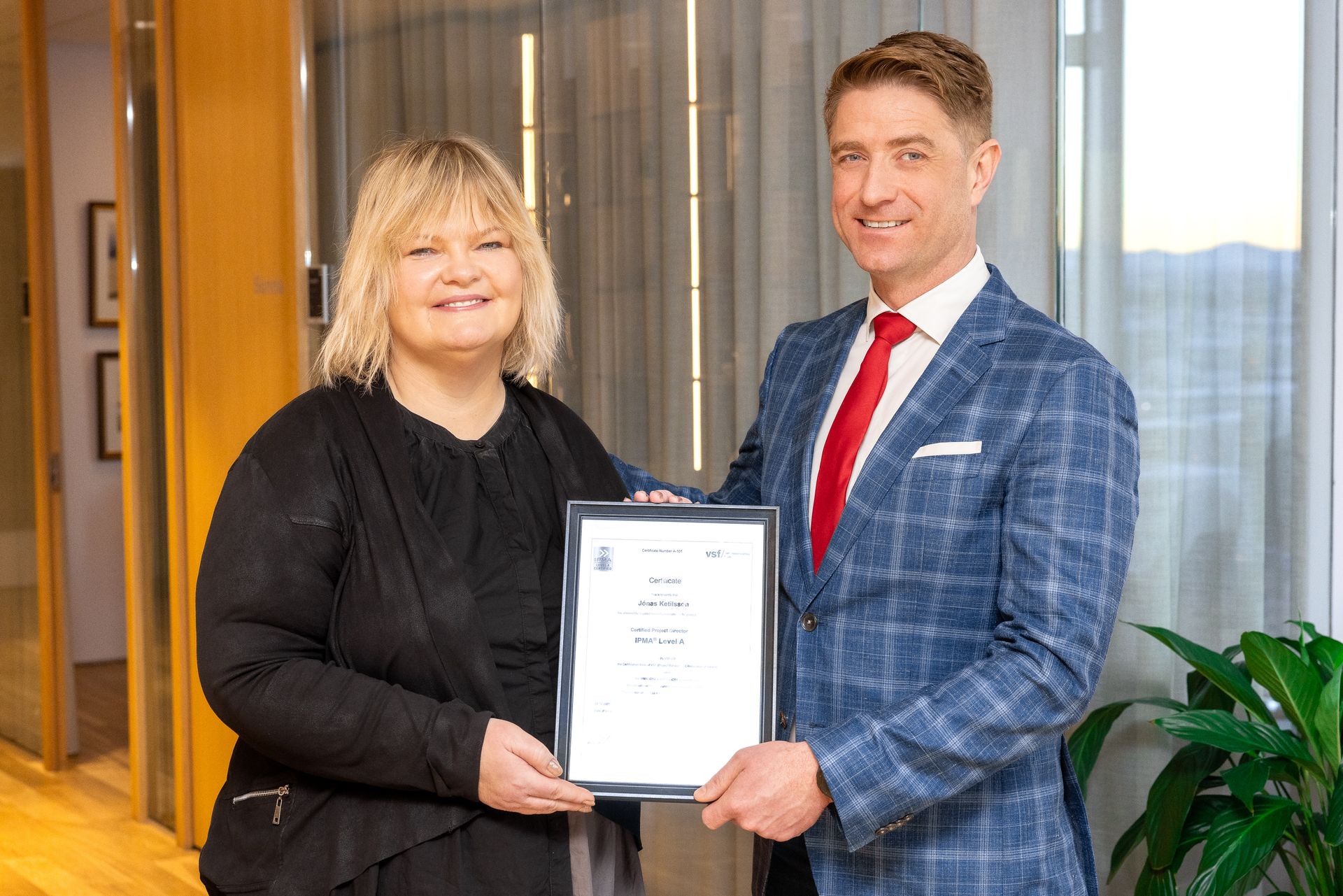 Á myndinni að neðan má sjá Agnesi Hólm Gunnarsdóttur, ábyrgðaaðila IPMA vottana á Íslandi afhenda Jónasi IPMA A skírteinið: